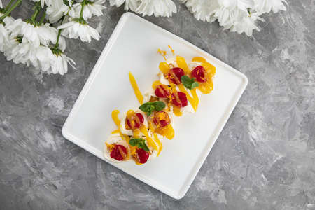 Close up photography of a fancy panna cotta with strawberries. Shallow dof