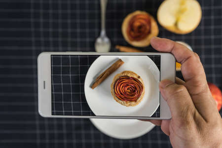 Taking photo with smart phone of food in restaurant, take photo with mobile phone.