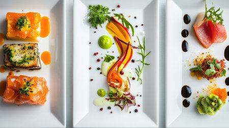 This stunning image showcases three elegant gourmet dishes beautifully arranged on minimalist plates, featuring fresh ingredients and vibrant edible flowers.