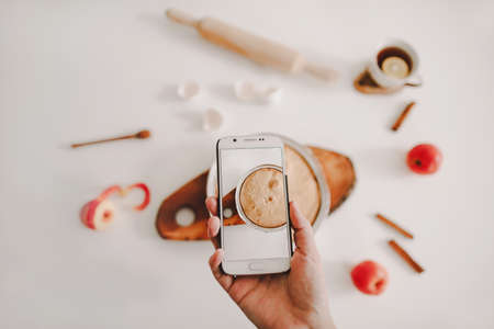 Food blogger takes photo on smartphone for social networks. Female hand holding cell phone with photo of cooking process of homemade Fermented probiotic superfood pineapple beverage