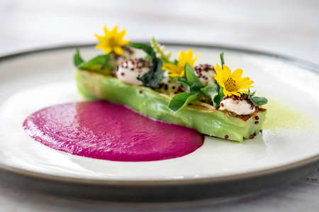 baked potatoes stuffed with salmon and cheese. With vegetables on a white plate in a top restaurant