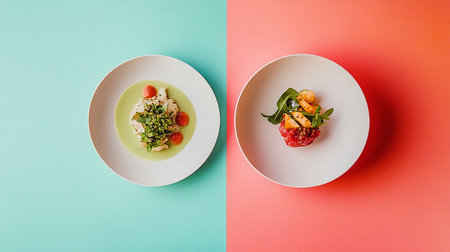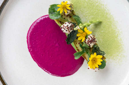 An exquisitely plated gourmet dish viewed from directly above, showcasing culinary artistry. The white plate features vibrant swirls of beetroot and mango puree, dollops of pesto, delicate foam, and is garnished with microgreens and edible flowers.