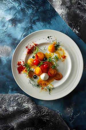 A vibrant salad featuring cherry tomatoes, blueberries, and mint sits elegantly on a stylish plate, complemented by a bright, flavorful dressing.