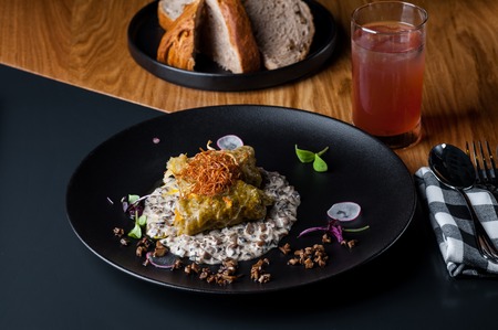 golubtsi Cabbage with rice and meat on a plate of buckwheat and carrots