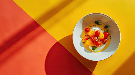 A beautifully arranged gourmet dessert features a creamy base topped with vibrant fruits and garnished with edible flowers. This artistic presentation showcases culinary creativity.