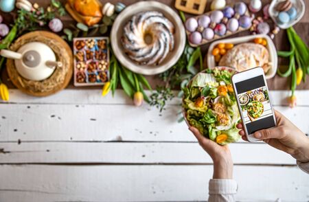 Easter holiday. Photo from your phone, beautifully preserved table, for a festive Easter lunch or Breakfast . The concept of family values and the Easter holiday. top view