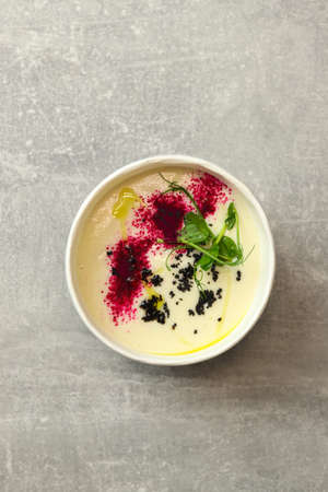 Cauliflower puree potato soup in round bowl on a gray background, top view. Vegetarian healthy food delivery concept