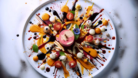 Abstract expressionist style food art using splattered sauces and purees on white plate, Ai created image