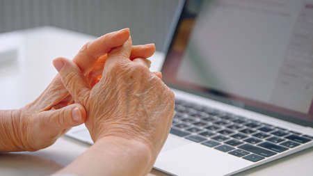 Old woman company manager holds wrinkly hands over keyboard and types against blurred table with light reflections at home closeup
