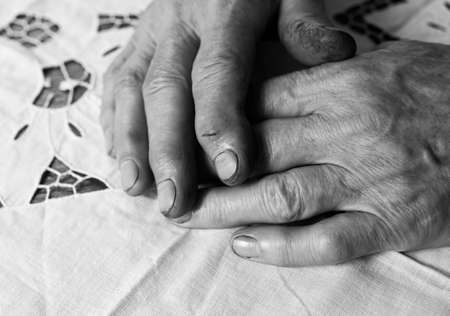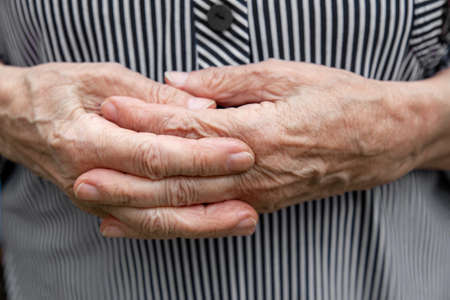 The hands of an elderly lady experiencing severe arthritic rheumatic pains. Close-up of an elderly woman's hands. Hands by affected arthritis of the joints on the fingers and wrinkled skin.
