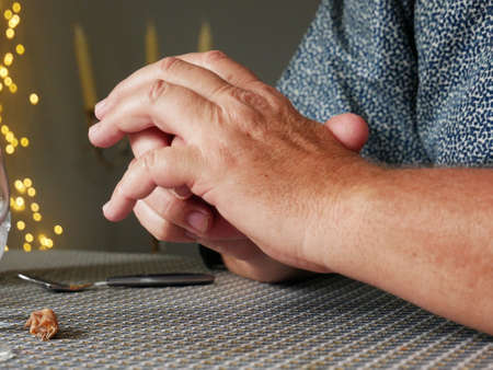 Senior woman's touching her hands and praying, Close up & Macro shot, Selective focus, Asian Body skin part, Body language feeling, Religious concept