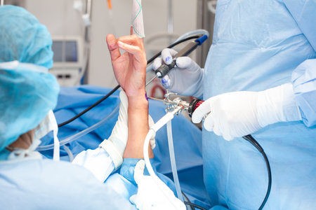 Group of orthopedic surgeons performing a wrist arthroscopy on a male patient. Female doctor performing a surgery. Orthopedic surgeon. Surgery and insurance concept.