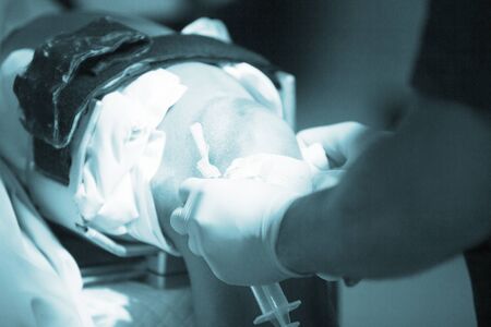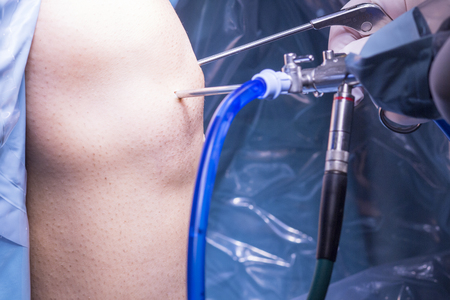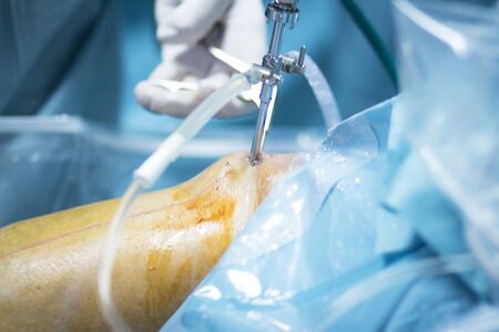 Surgical operation for knee arthroscopy micro surgery in hospital operating theater emergency room of traumatology and orthopedics.