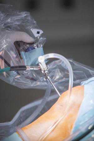 Arthroscope surgery. Orthopedic surgeons in teamwork in the operating room with modern arthroscopic tools. Knee surgery. Hospital background