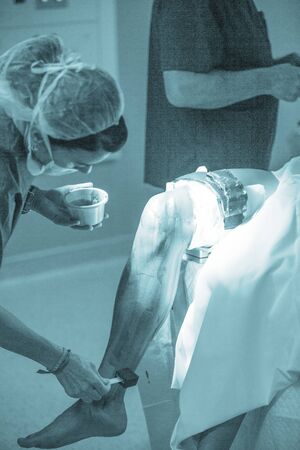 Hospital emergency orthopedics and traumatology surgery operating room medical clinic real life photo in foot, ankle and leg arthroscopy orthopedic operation.