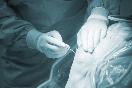Hospital orthopedics Traumatology surgical operation on torn meniscus in knee emergency operating room photo.