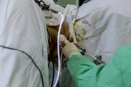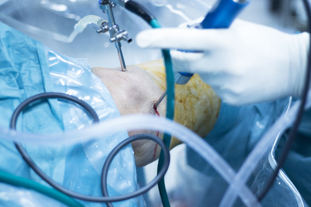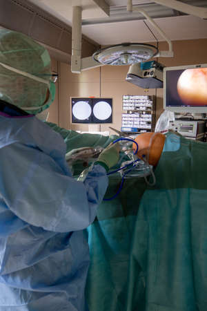 Surgical operation knee arthroscopy micro surgery in hospital operating theater emergency room for traumatology and orthopedics.