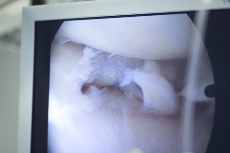 Hospital keyhole micro surgery arthroscopy operation screen showing arthroscope camera internal body image photo.