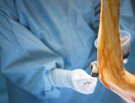 Group of surgeons performing an orthopedic surgery. Female doctor performing a surgery. Orthopedic surgeon. Surgery and insurance concept.