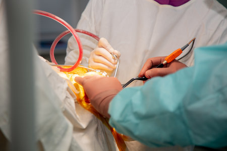 Team surgeon at work in operating room. Surgical light in the operating room. Preparation for the beginning of surgical operation with a cut. The surgeon is performing surgery on the patient.