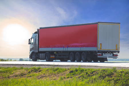 Modern wagon truck transports cargo against the backdrop of a sunset. The concept of truck drivers in the field of freight and logistics, copy space
