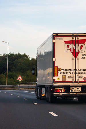 Loaded European truck in motion on asphalt road, transportation and delivery concept. Bucharest, Romania, 2020