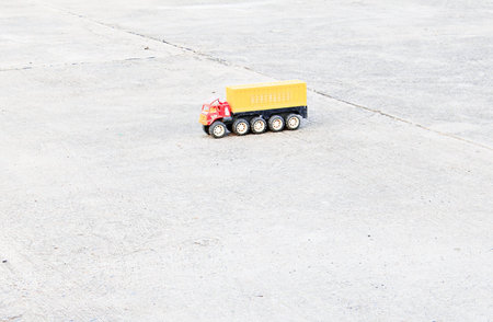 Toy car transporter with cars on a yellow background with place for text, copy space, for a toy store.