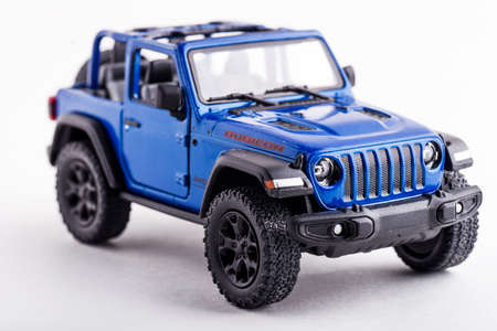 08 November 2020 Ukraine, Zaporizhzhya. Model of toy car on a yellow background with place for text. Banner for toy store toy typewriter cars.