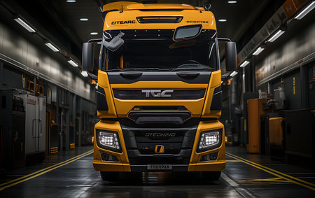 Line of delivery vans parked in a spacious warehouse, featuring modern designs and bright headlights, highlighting the importance of logistics and transportation