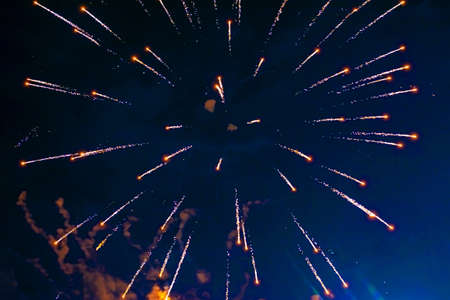 Fireworks against the night sky. Orange and yellow lights of the fireworks. Beautiful abstract drawing. Soon new year. Happy mood.