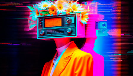 Creative surreal portrait of a woman with a retro radio and a flower on her head in an orange suit.