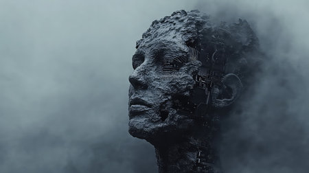 This surreal portrait depicts a cyborg woman partially emerging from fog, symbolizing the merging of humanity with technology in a dark, thought-provoking landscape.