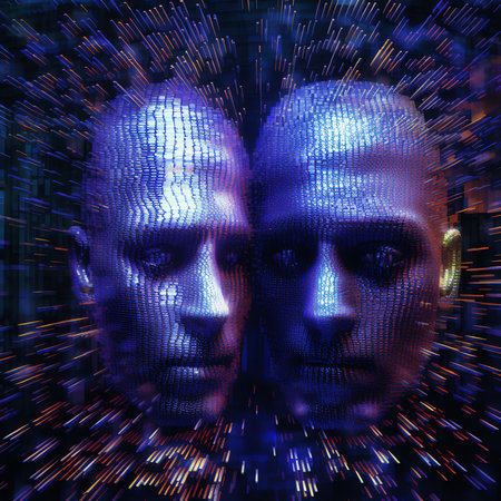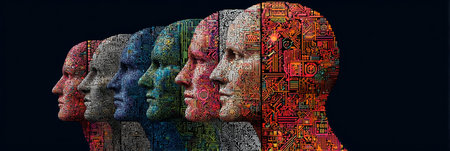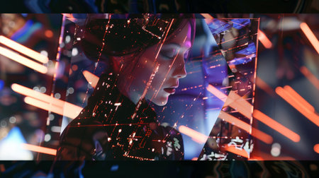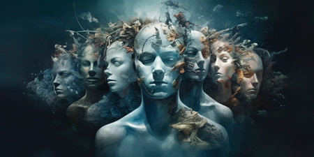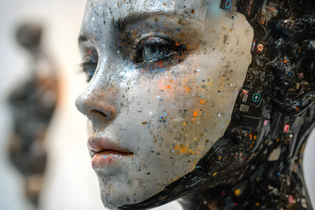 Abstract illustrations of digital faces merging with technology in artistic photography