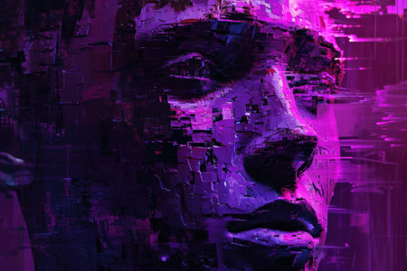 The close up picture of human face with emotionless expression that the picture has neon glitch effect that feels like from scifi or science fiction futuristic cyberpunk artstyle yet dystopia. AIGX01.