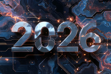The image is a futuristic representation of the year 2026. The year is displayed in large, glowing numbers, surrounded by a metallic, futuristic design. Scene is one of excitement