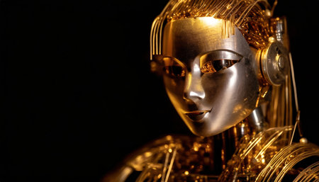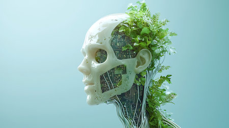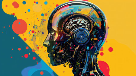 futuristic robotic head, artificial intelligence, brain concept, colorful abstract background, high tech design, innovation, digital art, science fiction elements, profile view, vivid colors