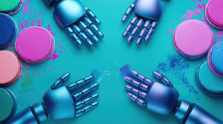 Robotic hands with makeup brushes and colorful powders on vibrant turquoise background.