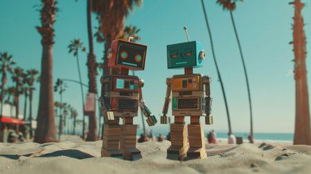 cute funny robots at sunny beach at vacation, cyborg travelling. High quality photo