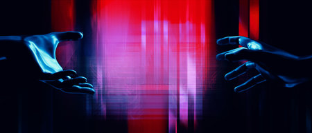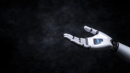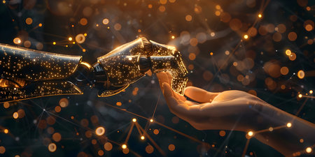 Innovative technology intersection human hand and robot interface with data connections. Concept Human-Robot Interaction, Data Connectivity, Innovative Technology