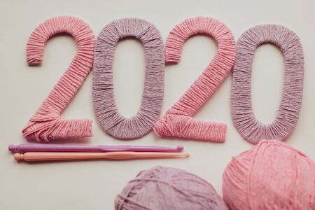 The inscription 2020 from multi-colored buttons on a dark old wooden table background. Happy New Year