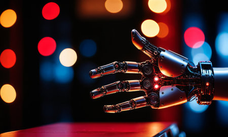 A sleek robotic hand gracefully presents a small gift labeled Happy New Year amidst a backdrop of shimmering, colorful lights, creating a festive and futuristic atmosphere.