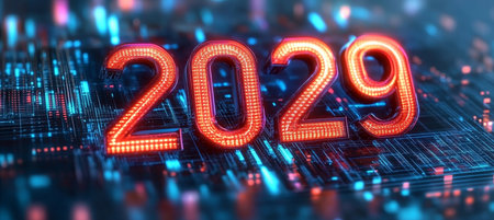 Glowing Digital Big 3D Number 2029 in Futuristic Style on Digital Abstract Background