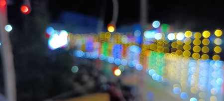 Beautiful Line of Outdoor Holidays Festival market lighting with bokeh at night. Abstract line of LED light bokeh defocused background
