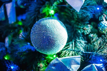 ball on Christmas artificial trees branches on branches closeup with colorful lights and blurred background
