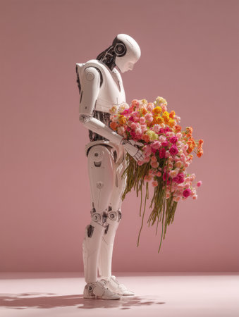 A humanoid robot stands quietly, holding a large bouquet of colorful flowers in a serene environment.