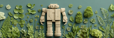 A cardboard robot stands prominently, surrounded by an array of vibrant green plants, creating a lively and fresh scene.