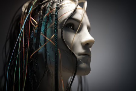 Artificial humanoid figure with a pale face and multicolored cables resembling hair, set against a dark background, suggesting a futuristic or robotic theme. No visible text