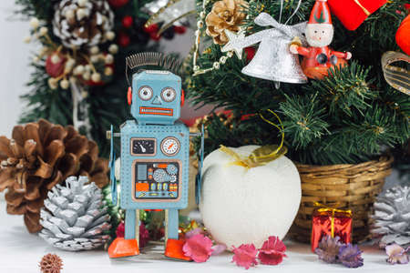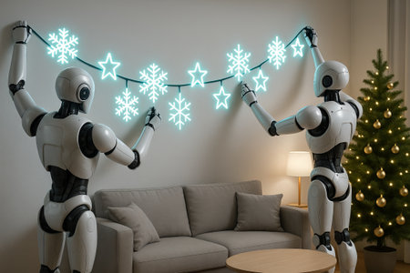 Futuristic robots hanging digital star and snowflake garland in modern living room with christmas tree. concept of festive decor, holiday innovation, celebration..