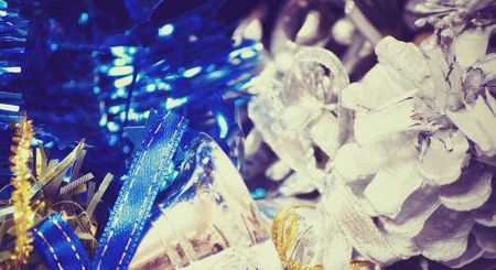 Christmas decorations on the Christmas tree, snowflakes, balls, garlands, closeup, texture, background New year concept