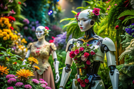 Vibrant flowers bloom in harmony with technologically advanced robotic models showcasing elegant attire amidst lush greenery, epitomizing the intersection of nature and innovation.